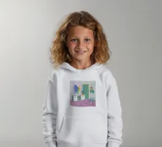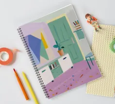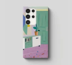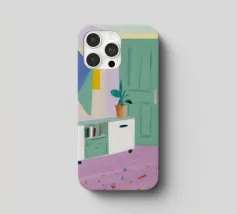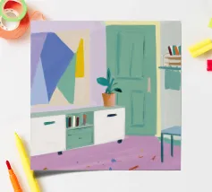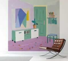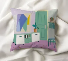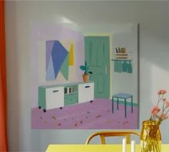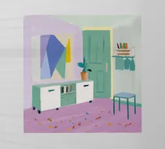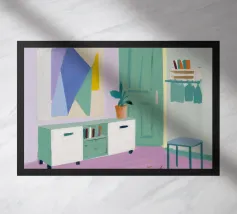 Illustrazione di uno spazio interno moderno con un mobile verde menta, una sedia blu e fogli sparsi su un pavimento rosa. La composizione ha un aspetto calmo, leggermente disordinato e vissuto, con una tavolozza di colori freschi.