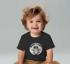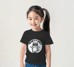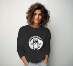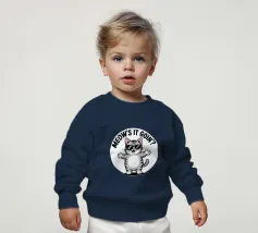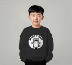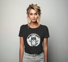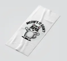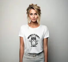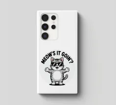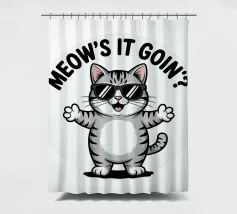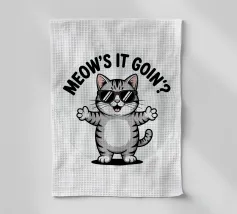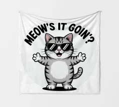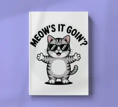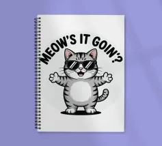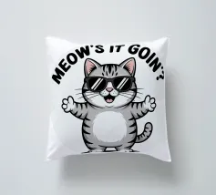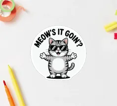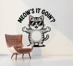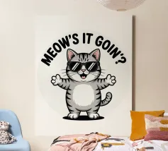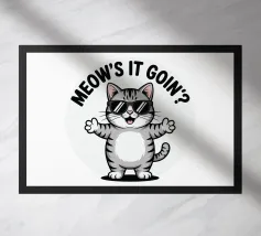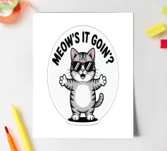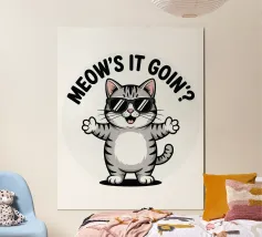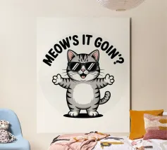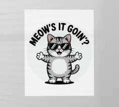 Un gatto cool che indossa occhiali da sole si erge fiducioso con le braccia tese all'interno di una cornice circolare. La frase "MEOW'S IT GOIN'?" è scritta in grassetto e aggiunge un tocco giocoso.