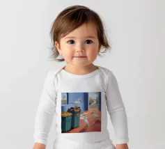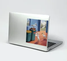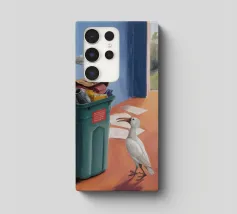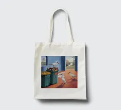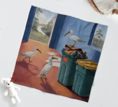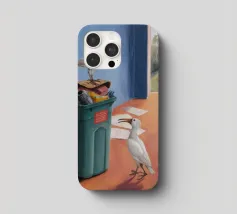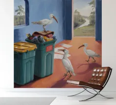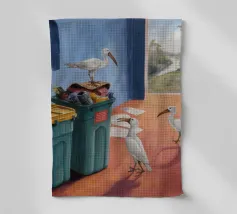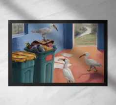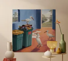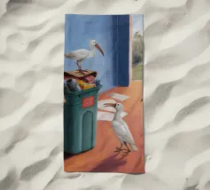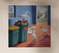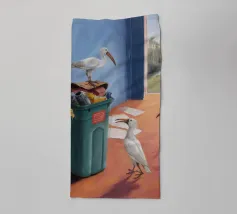 Due uccelli bianchi, forse gabbiani, si trovano in mezzo a uno spargimento di buste accanto a bidoni verdi in riva al mare. Il dipinto giustappone la bellezza naturale degli uccelli e della costa con il disordine prodotto dall'uomo, creando una narrazione della vita di mare.