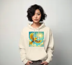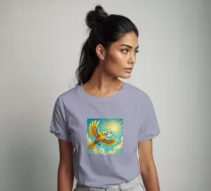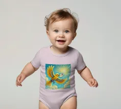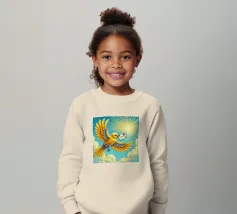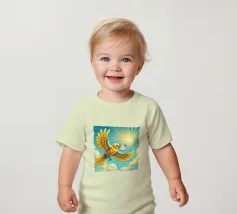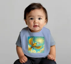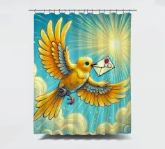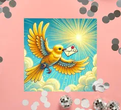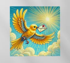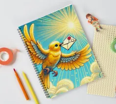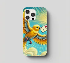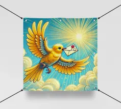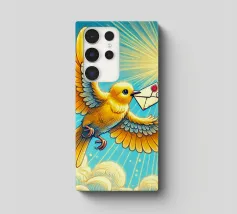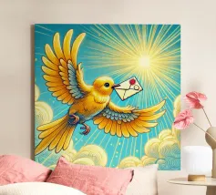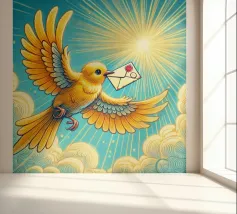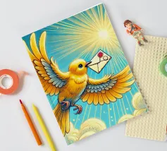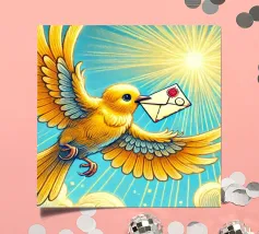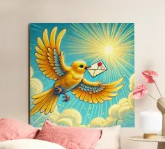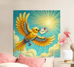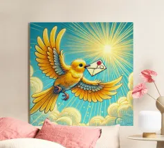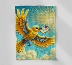 Una deliziosa illustrazione in stile cartoon con un piccolo e vivace uccello che vola in un cielo soleggiato con una lettera nel becco. Le piume gialle dell'uccello brillano con sottili accenti blu, creando un'atmosfera vivace e allegra.