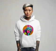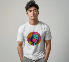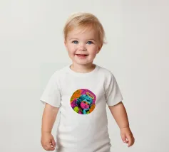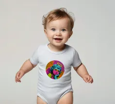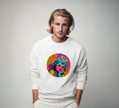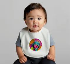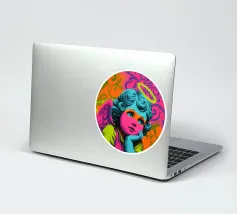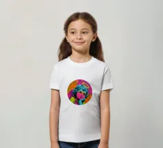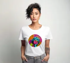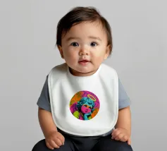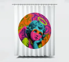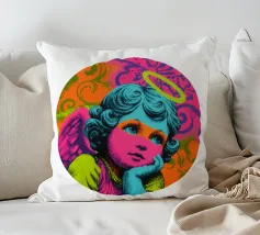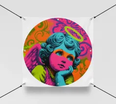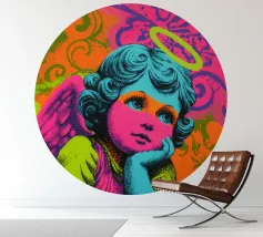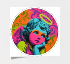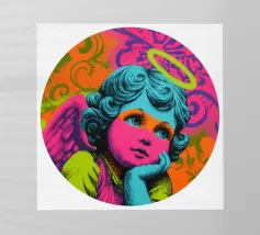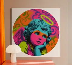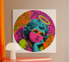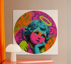Un incantevole ritratto di angelo in stile pop art con capelli ricci, aureola e grandi occhi irradia tenerezza. Circondato da ornamenti floreali in colori vivaci, crea un'atmosfera allegra e invitante!