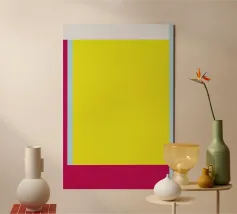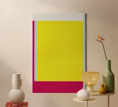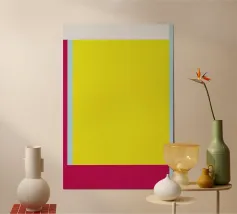 Questa stampa d'arte moderna colpisce per la sua chiara geometria e la vivace combinazione di colori. Con un giallo deciso, un rosso bordeaux e un accenno di azzurro, questo disegno astratto cattura immediatamente l'attenzione. L'approccio minimalista conferisce all'immagine un equilibrio rasserenante, mentre i colori vivaci creano un interessante contrasto. Perfetto per gli amanti dell'arte contemporanea che desiderano aggiungere un elemento elegante e colorato alle loro stanze.
