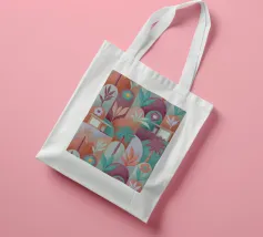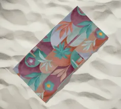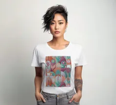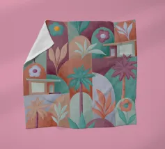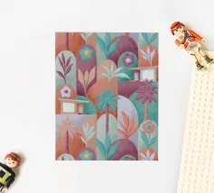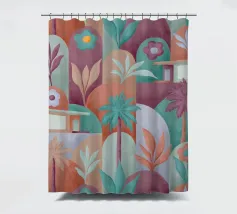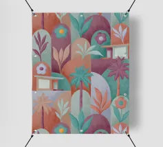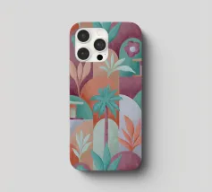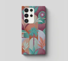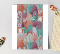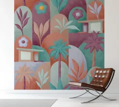 Caldo motivo moderno di metà secolo, una composizione massimalista con forme geometriche, palme, foglie tropicali, architettura e fiori.