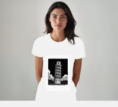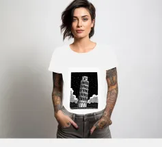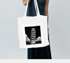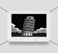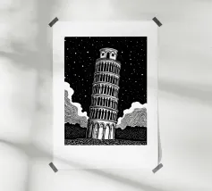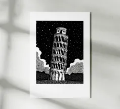 Celebrate il fascino italiano con questa stampa in stile linoleografico della Torre di Pisa. Caratterizzata da un'audace scena notturna in bianco e nero con nuvole e stelle stilizzate, quest'opera d'arte cattura l'iconica architettura con un look unico, intagliato a mano. Perfetta per gli amanti dell'Italia, dell'arte di viaggio e dell'arredamento minimalista con un tocco vintage.