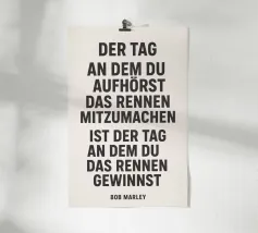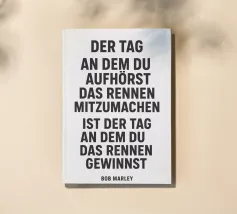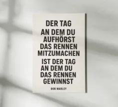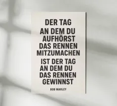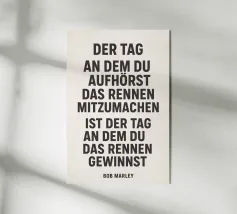"Il giorno in cui smetti di correre la gara è il giorno in cui vinci la gara". - Una potente citazione di Bob Marley che dispiega il suo effetto in una tipografia chiara su uno sfondo chiaro. Questo poster conferisce calma, profondità e auto-riflessione agli ambienti moderni, sia in ufficio che in soggiorno o in corridoio. Una dichiarazione a favore di una maggiore consapevolezza e indipendenza. Minimalista. Chiaro. Forte.