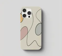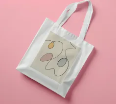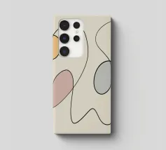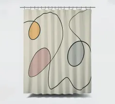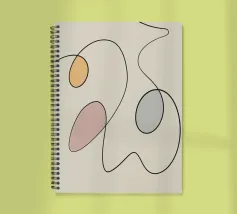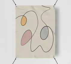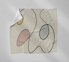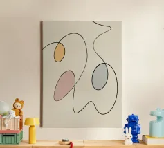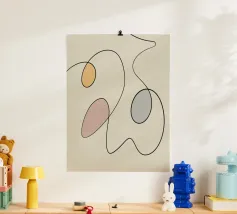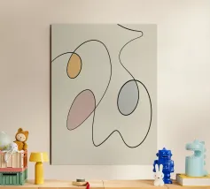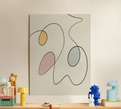 Linee nere curve si intrecciano con tre forme ovali riempite con colori tenui come il giallo, il rosa e il blu, creando un design minimalista. La semplicità delle linee e le tonalità tenui aggiungono un effetto calmante alla composizione.