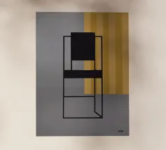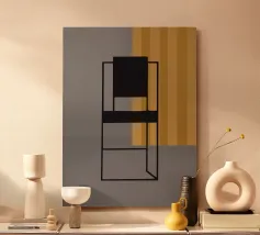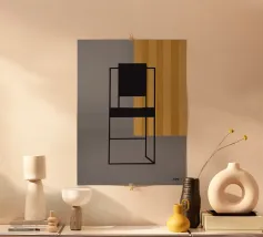 "Minimal - Black Chair" combina le forme chiare del Bauhaus con i colori vivaci del Suprematismo in un semplice oggetto quotidiano. Questo poster minimalista mostra una sedia nera su uno sfondo grigio e una tenda giallo oro. Le linee pulite e i colori contrastanti ne fanno un'opera d'arte senza tempo, ideale per interni eleganti e moderni. Perfetto per gli amanti del design e dell'arredamento minimalista, conferisce un accento elegante a qualsiasi salotto, ufficio o studio.