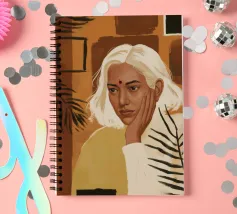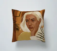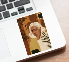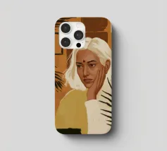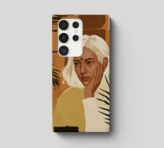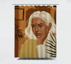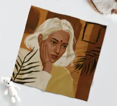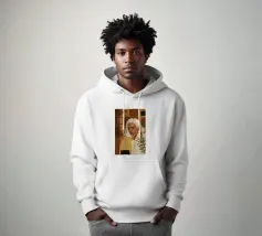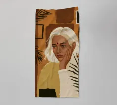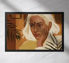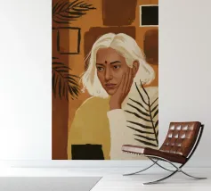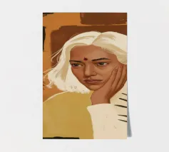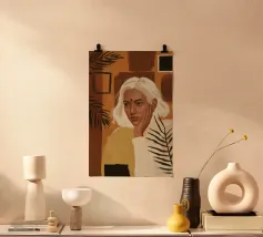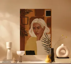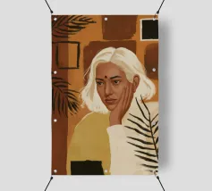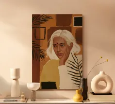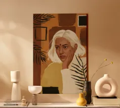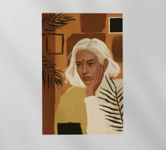 Questa opera d'arte raffigura una persona con i capelli bianchi su uno sfondo marrone con foglie nere. La composizione crea un senso di mistero e intrigo, con la persona parzialmente oscurata dal fogliame.