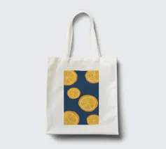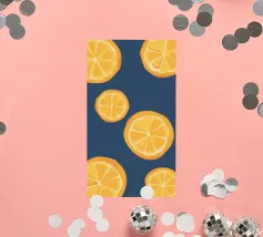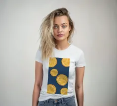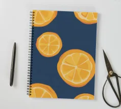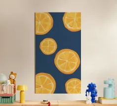 Un motivo grafico in stile pop art di fette d'arancia su uno sfondo blu scuro. La composizione è moderna, vibrante e rappresenta un design fresco, vivace ed elegante.