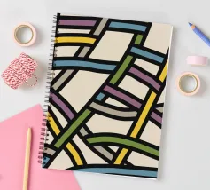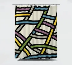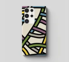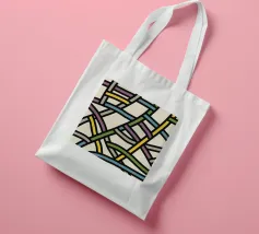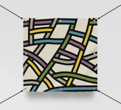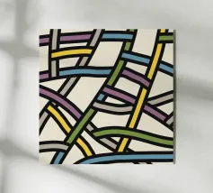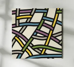 Le forme geometriche si intersecano e si sovrappongono in una complessa rete di linee e colori, creando un'estetica astratta e moderna. Diverse tonalità, tra cui giallo, verde, viola e blu, si stagliano su uno sfondo neutro, aggiungendo vivacità alla composizione angolare.