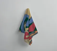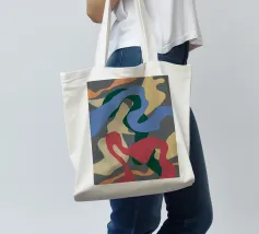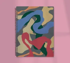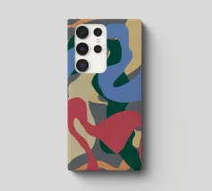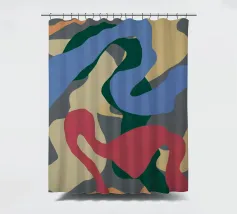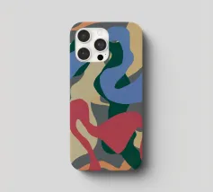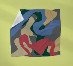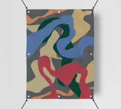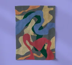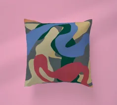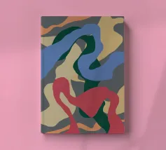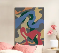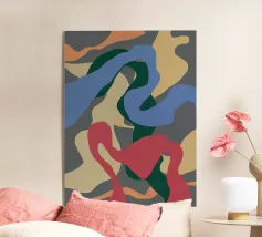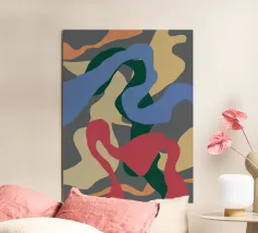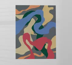Forme astratte di vari colori si intrecciano su uno sfondo tenue. Le sfumature di blu, rosso e beige spiccano e creano un senso di movimento attraverso le loro forme fluide.