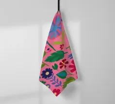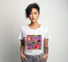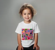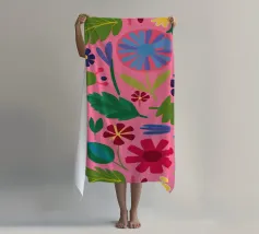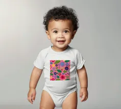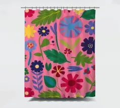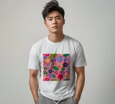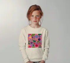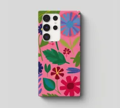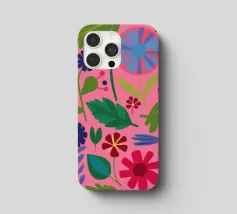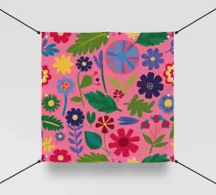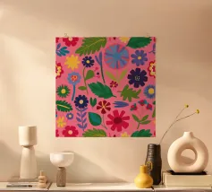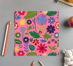 Un fitto disegno senza cuciture di fiori stilizzati di arte popolare in una tavolozza di colori vivaci e gioiosi di rosa, blu e arancione. Il disegno è vibrante e allegro.