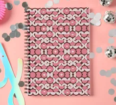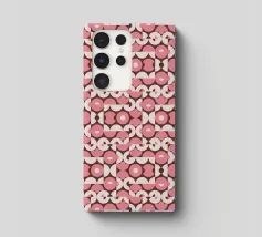 Un motivo geometrico ripetuto presenta forme rosa, marroni e bianche in disegni circolari e angolari. La disposizione simmetrica crea un effetto visivamente accattivante ed equilibrato.