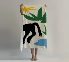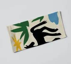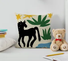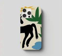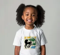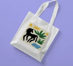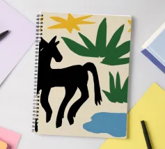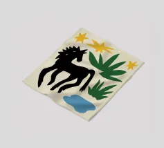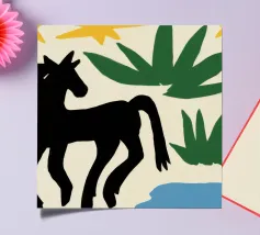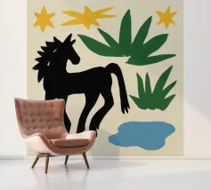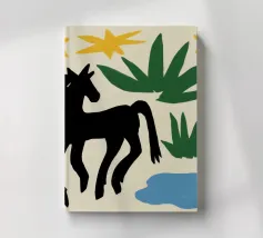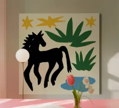 Quest'opera d'arte presenta un cavallo nero stilizzato in forma grafica e audace su uno sfondo neutro. Circondato da semplici foglie verdi astratte e da forme celestiali simili a stelle, il pezzo ha una qualità mitica e primordiale. La composizione minimalista enfatizza la potente silhouette del cavallo.