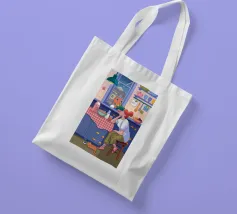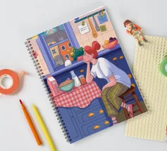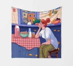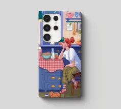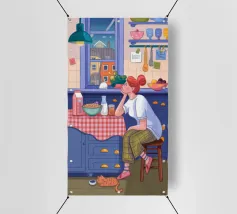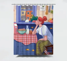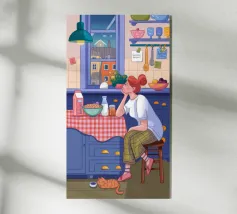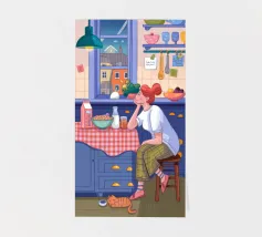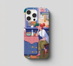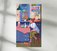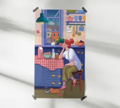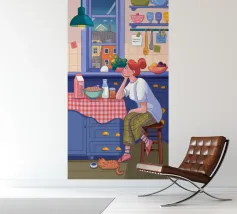 Una persona siede a un tavolo da cucina decorato, circondato da teiere, tazze e decorazioni da cucina. La vista di una finestra rende l'ambiente ancora più invitante.