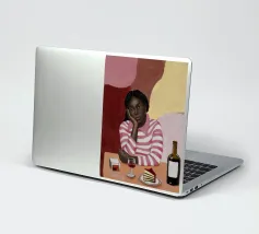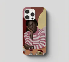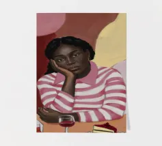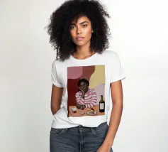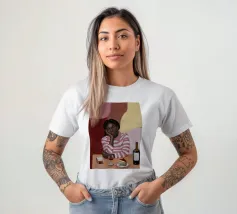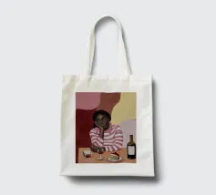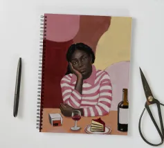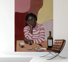 Una persona è seduta a un tavolo con un bicchiere di vino, una bottiglia e dei libri. Lo sfondo è un mix di colori rosso e beige.