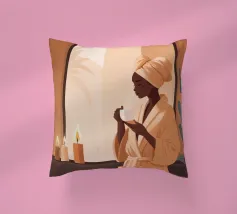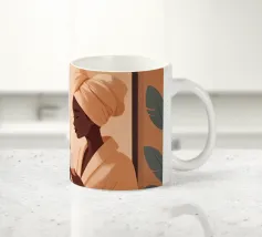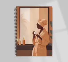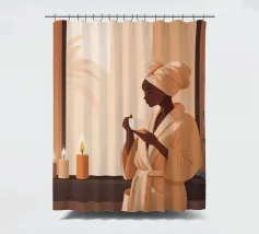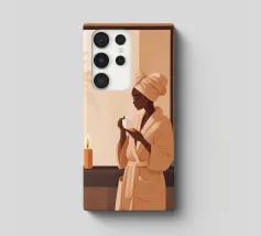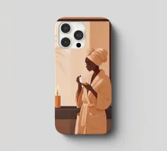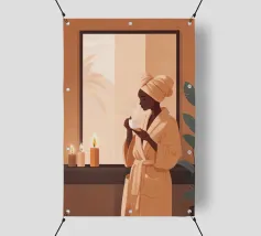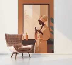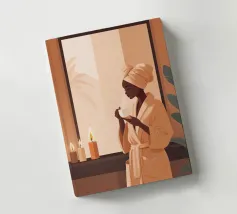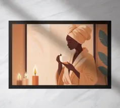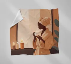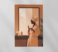 Una calda illustrazione minimalista di una donna in vestaglia che si gode una tazza di tè accanto a candele tremolanti. Questa opera d'arte incarna la cura di sé, la pace e l'arte di rallentare.