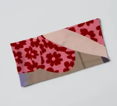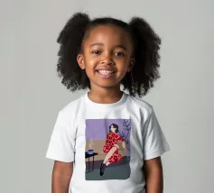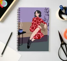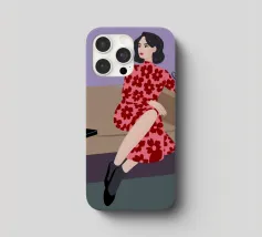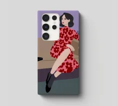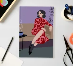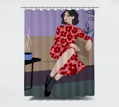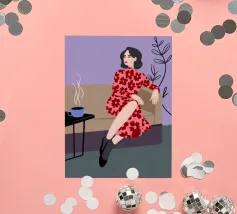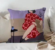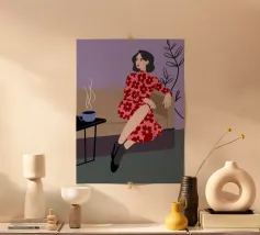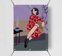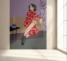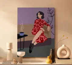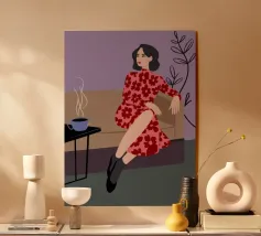 Una donna con un vestito rosso a fiori è seduta su una sedia con le gambe incrociate. Sul tavolino accanto a lei c'è una tazza di caffè fumante e lo sfondo è viola con una pianta.