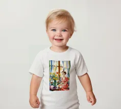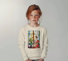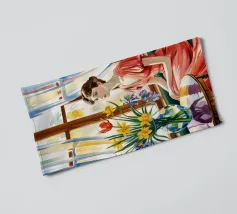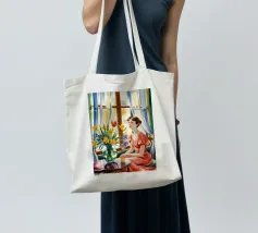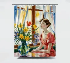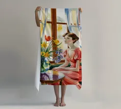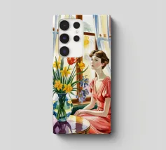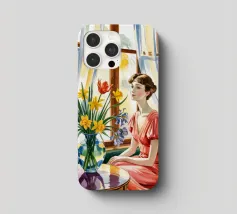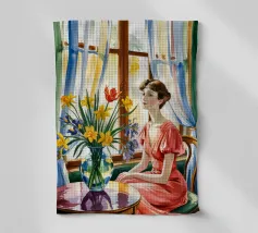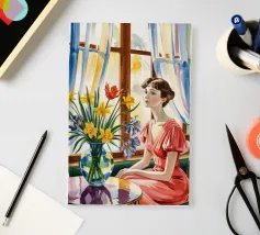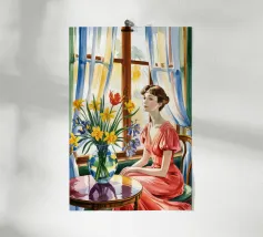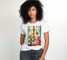 Una persona è seduta a un tavolo con un vaso di fiori e guarda fuori da una finestra immersa nella calda luce del sole. La scena evoca un senso di tranquilla contemplazione.