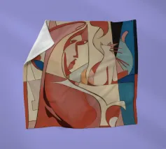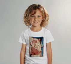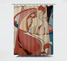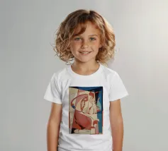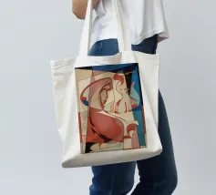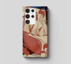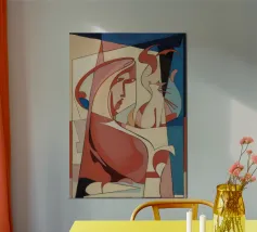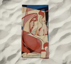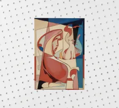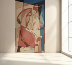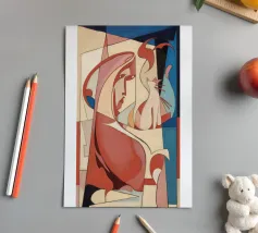 Questo dipinto raffigura due figure astratte in una tenera interazione, resa con colori tenui come il beige, il rosso e il blu. La composizione è intima e delicata e trasmette un senso di affetto e connessione.