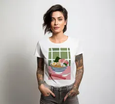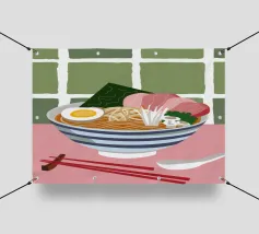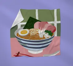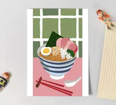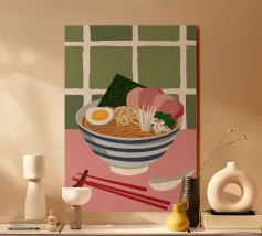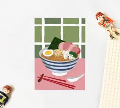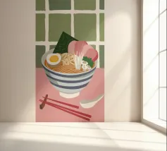 Una confortante ciotola di ramen fumante è illustrata con dettagli meticolosi, dalla lucentezza del brodo all'attento posizionamento dei condimenti. Quest'opera è più di un semplice cibo: è una celebrazione del comfort, del calore e dell'arte rilassante di un pasto ben fatto.