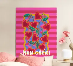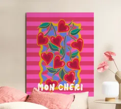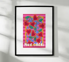Festeggiate San Valentino con la mia adorabile illustrazione di ciliegie, caratterizzata dalla romantica frase Mon Chéri. Perfetta come regalo o come incantevole elemento d'arredo per diffondere l'amore! ❤️🎨