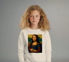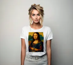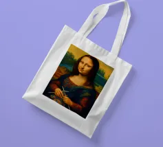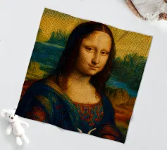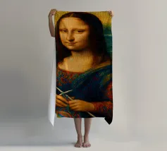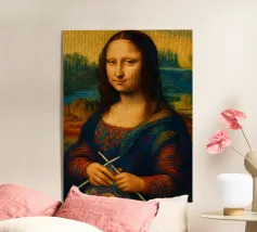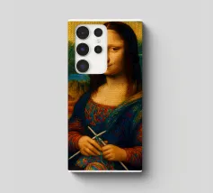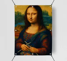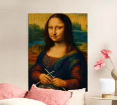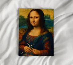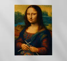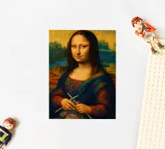 Divertente ritratto artistico della Gioconda che lavora a maglia con i ferri e un gomitolo di lana. Non si tratta di lana vera o di un vero lavoro a maglia, ma di un effetto artistico.