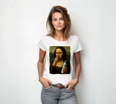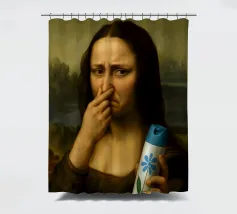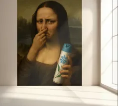 La Monna Lisa che si tappa il naso a causa del cattivo odore nel bagno con in mano una bomboletta di deodorante per WC.