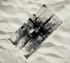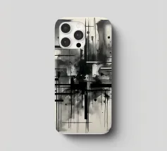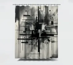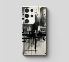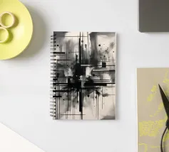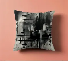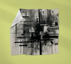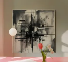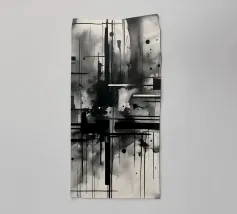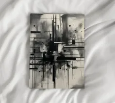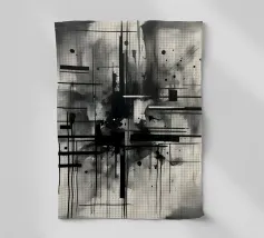 Arte astratta monocromatica - Suite di 2 pezzi intitolata Caos e Struttura - Questo è il pezzo 1 di 2. Linee nere marcate, griglie che si intersecano e schizzi d'inchiostro sparsi convergono in un'esplosione centrale di energia che attira lo spettatore verso l'interno. Strati di lavaggi grigio fumo ammorbidiscono la geometria, creando profondità e atmosfera, mentre elementi lineari nitidi impongono ordine al movimento fluido.