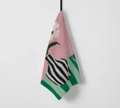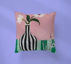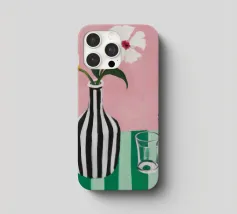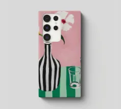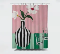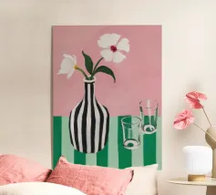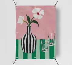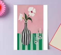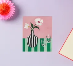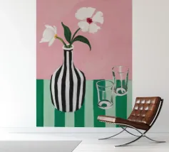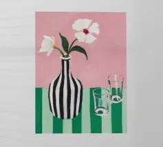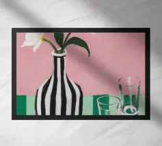 Una natura morta elegante e minimalista di un singolo fiore bianco in un vaso a righe bianche e nere, con un bicchiere d'acqua su una superficie a righe verdi.