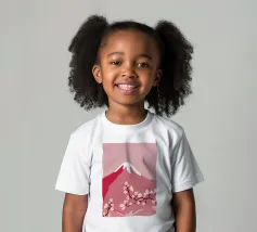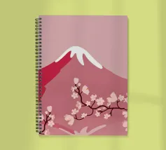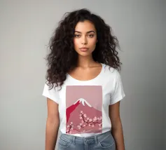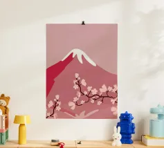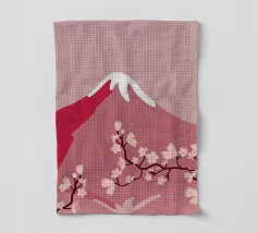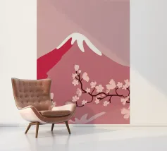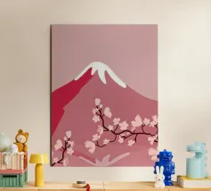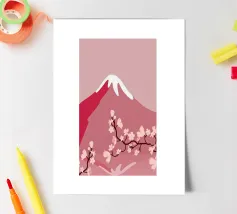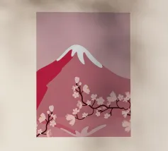 Un design elegante e minimalista che combina la delicatezza dei toni rosa e la bellezza dei fiori di pesco con una reinterpretazione stilizzata del Monte Fuji. La scena cattura la serenità di un paesaggio giapponese, con linee semplici e fluide che richiamano la naturalezza dei fiori e la maestosità della montagna, creando un perfetto equilibrio tra natura e arte contemporanea.