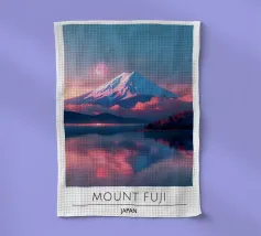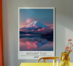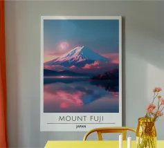 Portate l'iconica serenità del Giappone sulle vostre pareti con questa stampa digitale mozzafiato del Monte Fuji. L'opera d'arte cattura il maestoso vulcano innevato e il suo perfetto riflesso nel tranquillo lago sottostante. La scena è illuminata da un cielo crepuscolare rosa e blu e da una grande luna rosa, creando un'atmosfera eterea e serena. Questo poster di viaggio di qualità superiore cattura magnificamente la maestosità del più famoso punto di riferimento naturale del Giappone. Fornito come file digitale ad alta risoluzione (7000x5000 pixel, 300 dpi), garantisce una stampa nitida e di qualità museale.