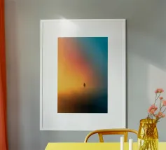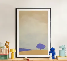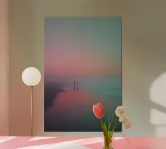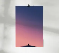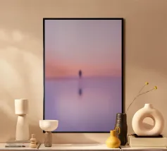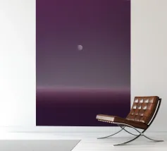 Una luna tranquilla si libra sopra un mare di velluto, immerso in profonde sfumature di viola e crepuscolo. Questa composizione minimale cattura la gravità dell'immobilità e l'attrazione silenziosa della presenza celeste, dove la notte non inizia con l'oscurità, ma con il colore e la calma.