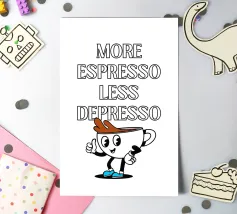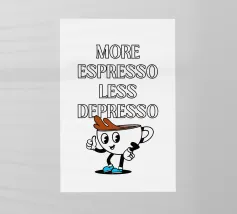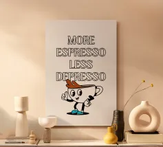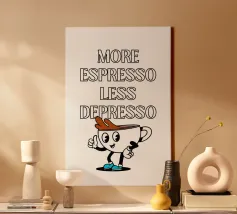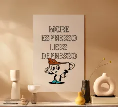 Iniettate umorismo ed energia nel vostro spazio con questo allegro poster digitale che riporta la spiritosa frase "MORE ESPRESSO LESS DEPRESSO". Il testo è presentato in un carattere grassetto e delineato, con un'affascinante tazzina da caffè in stile retrò che fa il pollice in su. La tazzina, completa di occhietti e scarpette blu, aggiunge un tocco stravagante a questo pezzo motivazionale. Su uno sfondo bianco e pulito, questa stampa è perfetta per gli amanti del caffè e per chi apprezza le risate. Questo poster digitale di alta qualità, fornito a 7000x5000 pixel e 300 dpi, porta con sé l'eccellenza della grafica contemporanea.