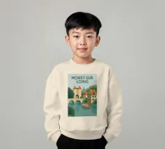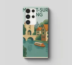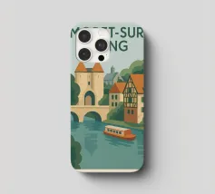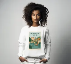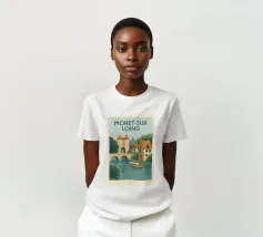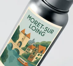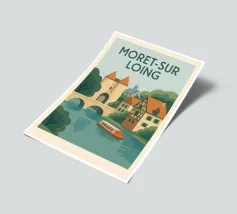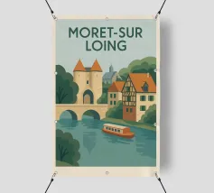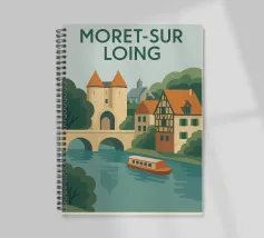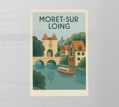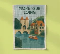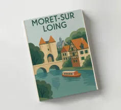 Moret-sur-Loing, un incantevole villaggio medievale nella regione Seine-et-Marne, viene qui sublimato in uno stile morbido e retrò. Un ponte di pietra, case a graticcio e un fiume tranquillo creano un ambiente autentico e poetico.