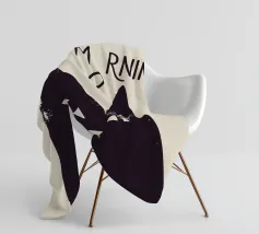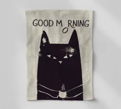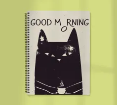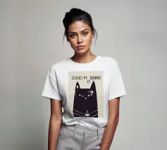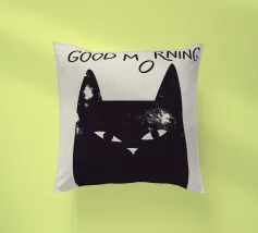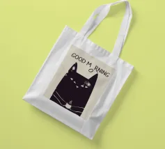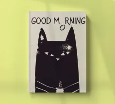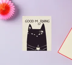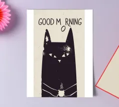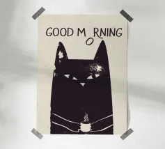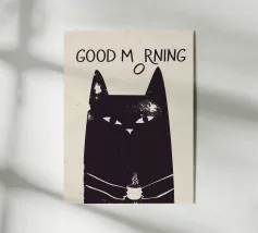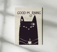 Un poster minimalista e umoristico con un gatto nero brontolone che tiene in mano una tazza di caffè fumante. La tipografia giocosa, con la "O" di "Morning" che scivola verso il basso, rende l'atmosfera mattutina sonnolenta e riluttante.