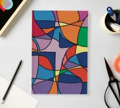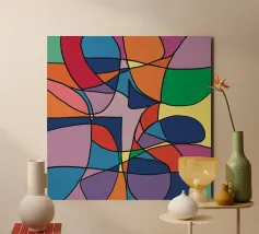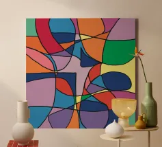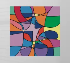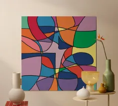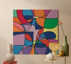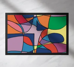 Una pletora di colori vivaci riempie la cornice, intersecata da linee nere e decise che creano un mosaico astratto di forme e tonalità. La colorazione distinta di ogni sezione contribuisce a creare un puzzle visivo giocoso e complesso che coinvolge l'occhio e l'immaginazione dell'osservatore.