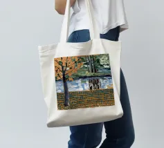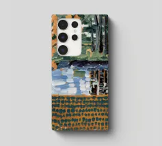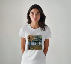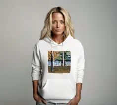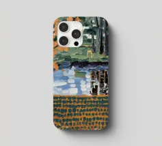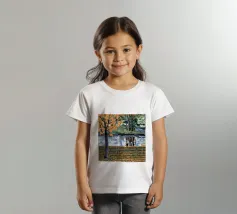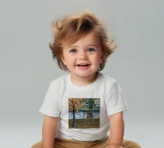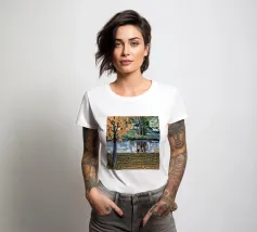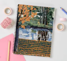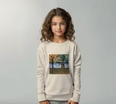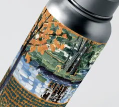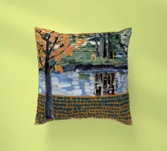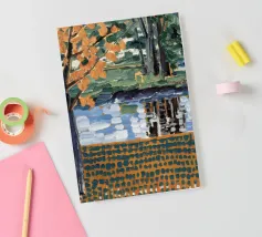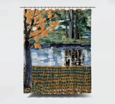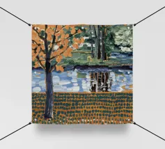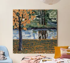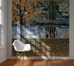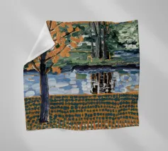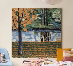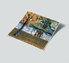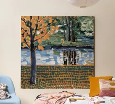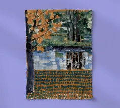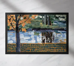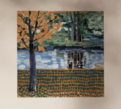 Un albero autunnale con foglie arancioni si affaccia su un lago sereno, il cui riflesso si frammenta in un mosaico dorato. La metà superiore del dipinto mostra la scena realistica di un albero solitario e dell'acqua, mentre la metà inferiore trasforma questi elementi in punti e tratti ritmici e astratti. Questa miscela creativa di motivi e natura è allo stesso tempo familiare e fantastica. Le calde tonalità autunnali e la composizione ritmica conferiscono all'opera una presenza vibrante ma tranquilla.