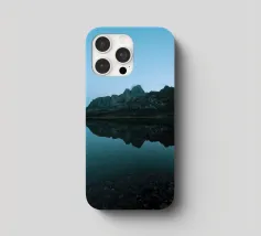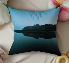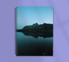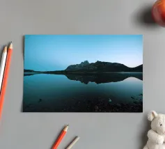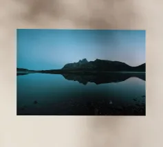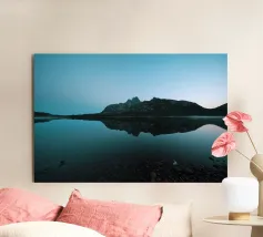 Montagne che si riflettono in un limpido lago di montagna al tramonto, durante l'ora blu, nel nord della Norvegia, nell'arcipelago delle Lofoten.