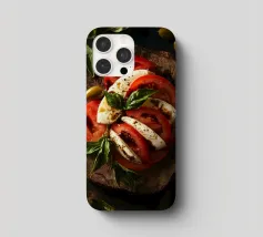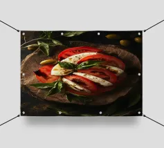pomodori mozzarella basilico olive piatto di legno insalata caprese erbe fresche fette sfondo scuro olio d'oliva pepe aceto balsamico ingredienti semplici prodotti freschi cucina italiana presentazione gourmet antipasto stile rustico foglie verdi illuminazione naturale