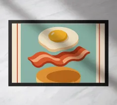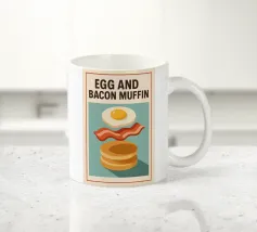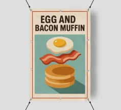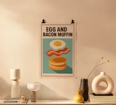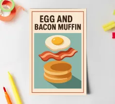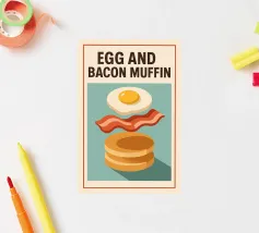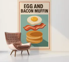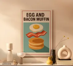 Mostrate il vostro amore per il Muffin con uova e pancetta con questa illustrazione in stile retrò. Un poster grafico e gastronomico che celebra l'iconica colazione anglosassone, perfetto per l'arredamento della cucina!