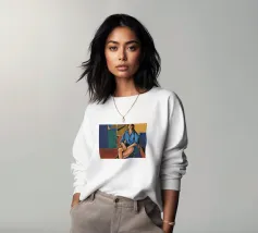 Una donna seduta in uno studio guarda serenamente in avanti, incorniciata da angoli audaci e tensione pittorica.