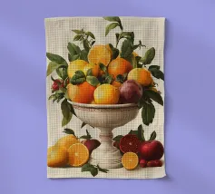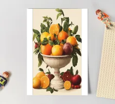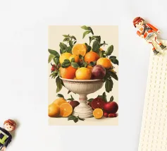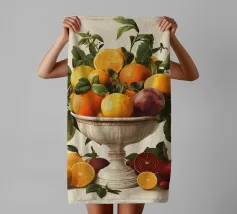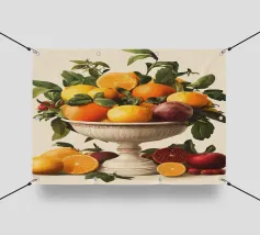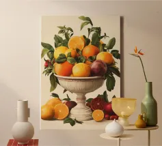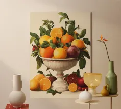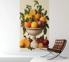 Questo sontuoso motivo raffigura un'antica ciotola piena di arance, limoni, melograni e foglie. I colori vivaci e il design classico ricordano gli antichi maestri, interpretati in chiave moderna. Ideale per cucine, sale da pranzo o stanze con interni eleganti, rustici o mediterranei. Perfetto per gli amanti dell'estetica classica e dei vivaci motivi naturali.
