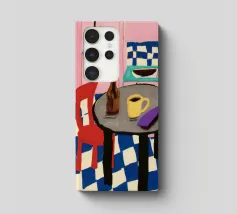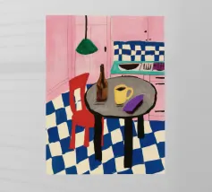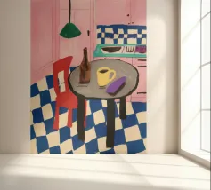 Una natura morta di una pianta e di una bottiglia su un tavolino, su un pavimento a scacchi bianchi e neri. La composizione è un pezzo moderno, grafico ed elegante con una forte attenzione all'interior design chic.
