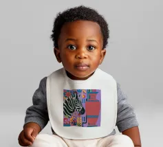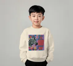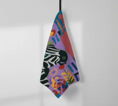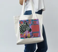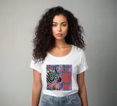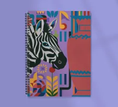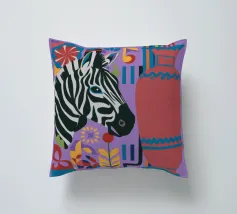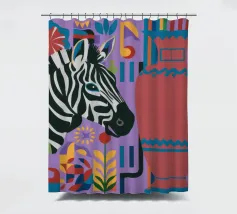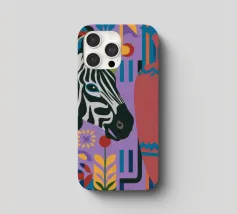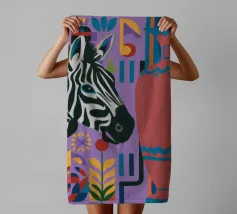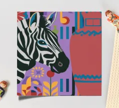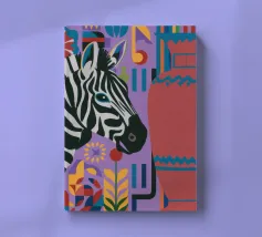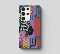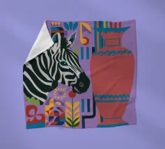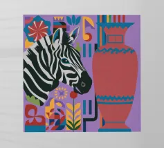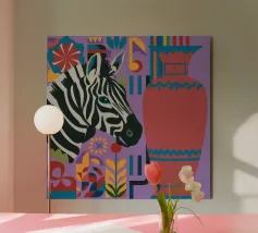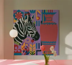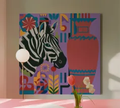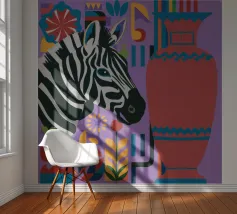 Una natura morta unica e artistica con la testa di una zebra accanto a un alto vaso viola a fantasia, che unisce la fauna selvatica a elementi di design moderno.