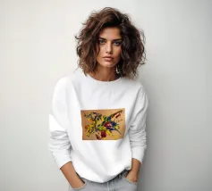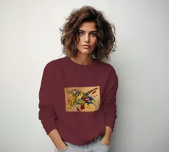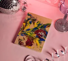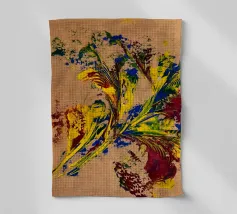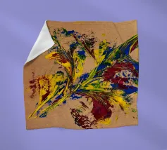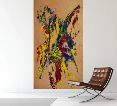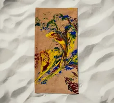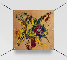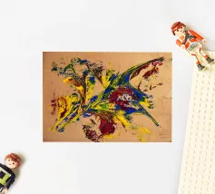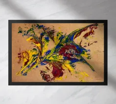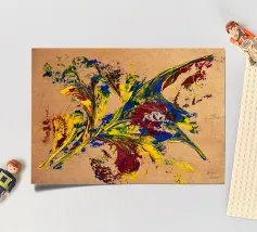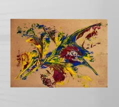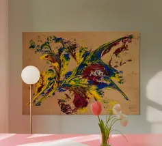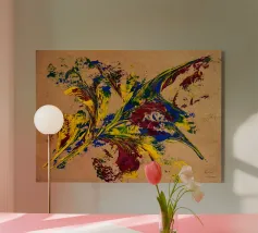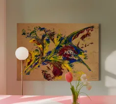 Quest'opera è realizzata su un foglio di cartone senza colorazione, lasciando visibili sullo sfondo le fibre di legno che la compongono. L'obiettivo è quello di presentare un'opera dipinta che mantenga un aspetto grezzo, offrendo un supporto che evochi la sua origine naturale. Il risultato è un'armonia e una maggiore facilità di integrazione in diversi stili di arredamento.