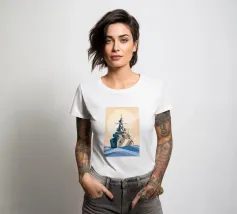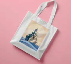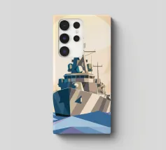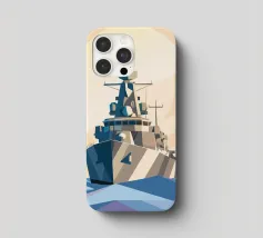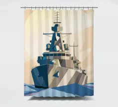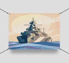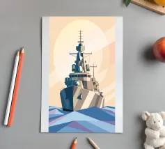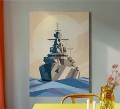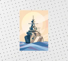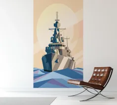 Illustrazione di una nave da guerra in mare con uno stile geometrico moderno.