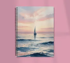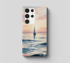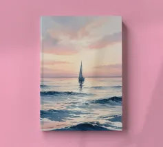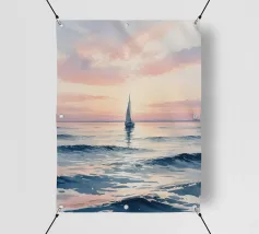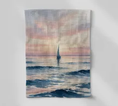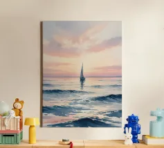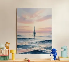 Una fuga pacifica su tela. Questo paesaggio marino acquerellato cattura il dolce movimento delle onde sotto un cielo pastello, con una barca a vela solitaria alla deriva verso l'orizzonte. Perfetto per aggiungere un tocco sereno e costiero a qualsiasi spazio.