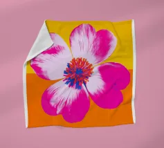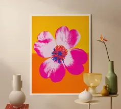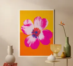 Quest'opera è un omaggio elettrizzante alla pop art, in cui le nature morte floreali vengono ridefinite. I colori radicalmente saturi - un rosa neon brillante per i petali, accentuato da un blu elettrico al centro, su uno sfondo spezzato di giallo brillante e arancione intenso - creano un'intensità quasi surreale. L'estremo contrasto cromatico e l'aspetto quasi serigrafico sono chiare allusioni alle iconiche rappresentazioni di Andy Warhol. L'effetto ipnotico è immediato: l'energica immagine vibra e irradia una sfrenata gioia di vivere.