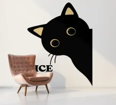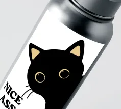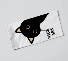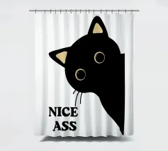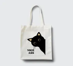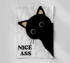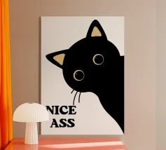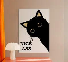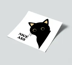 Un gatto nero con gli occhi spalancati sbircia curioso di lato, accompagnato dal testo in grassetto "NICE ASS" nell'angolo. Un design giocoso e umoristico.